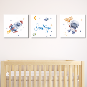 Nuestro set incluye 3 cuadros impresos en tela montados sobre bastidor de madera, listo para colgar. Medidas: 50x50cm. Puedes personalizar con nombre! Matenimiento: Puedes limpiar tus cuadros con un paño suave.Evita la en lo posible una exposición directa del sol. No incluye marco..