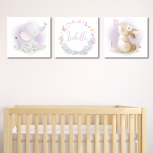 Nuestro set incluye 3 cuadros impresos en tela montados sobre bastidor de madera, listo para colgar. Medidas: 40x40cm. Puedes personalizar con nombre! Matenimiento: Puedes limpiar tus cuadros con un paño suave.Evita la en lo posible una exposición directa del sol. No incluye marco..