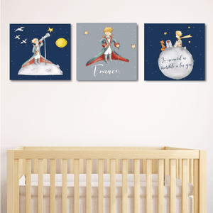Nuestro set incluye 3 cuadros impresos en tela montados sobre bastidor de madera, listo para colgar. Medidas: 50x50cm. Puedes personalizar con nombre! Matenimiento: Puedes limpiar tus cuadros con un paño suave.Evita la en lo posible una exposición directa del sol. No incluye marco..