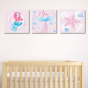 Nuestro set incluye 3 cuadros impresos en tela montados sobre bastidor de madera, listo para colgar. Medidas: 40x40cm. Puedes personalizar con nombre! Matenimiento: Puedes limpiar tus cuadros con un paño suave.Evita la en lo posible una exposición directa del sol. No incluye marco..