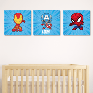 Nuestro set incluye 3 cuadros impresos en tela montados sobre bastidor de madera, listo para colgar. Medidas: 50x50cm. Puedes personalizar con nombre! Matenimiento: Puedes limpiar tus cuadros con un paño suave.Evita la en lo posible una exposición directa del sol. No incluye marco..